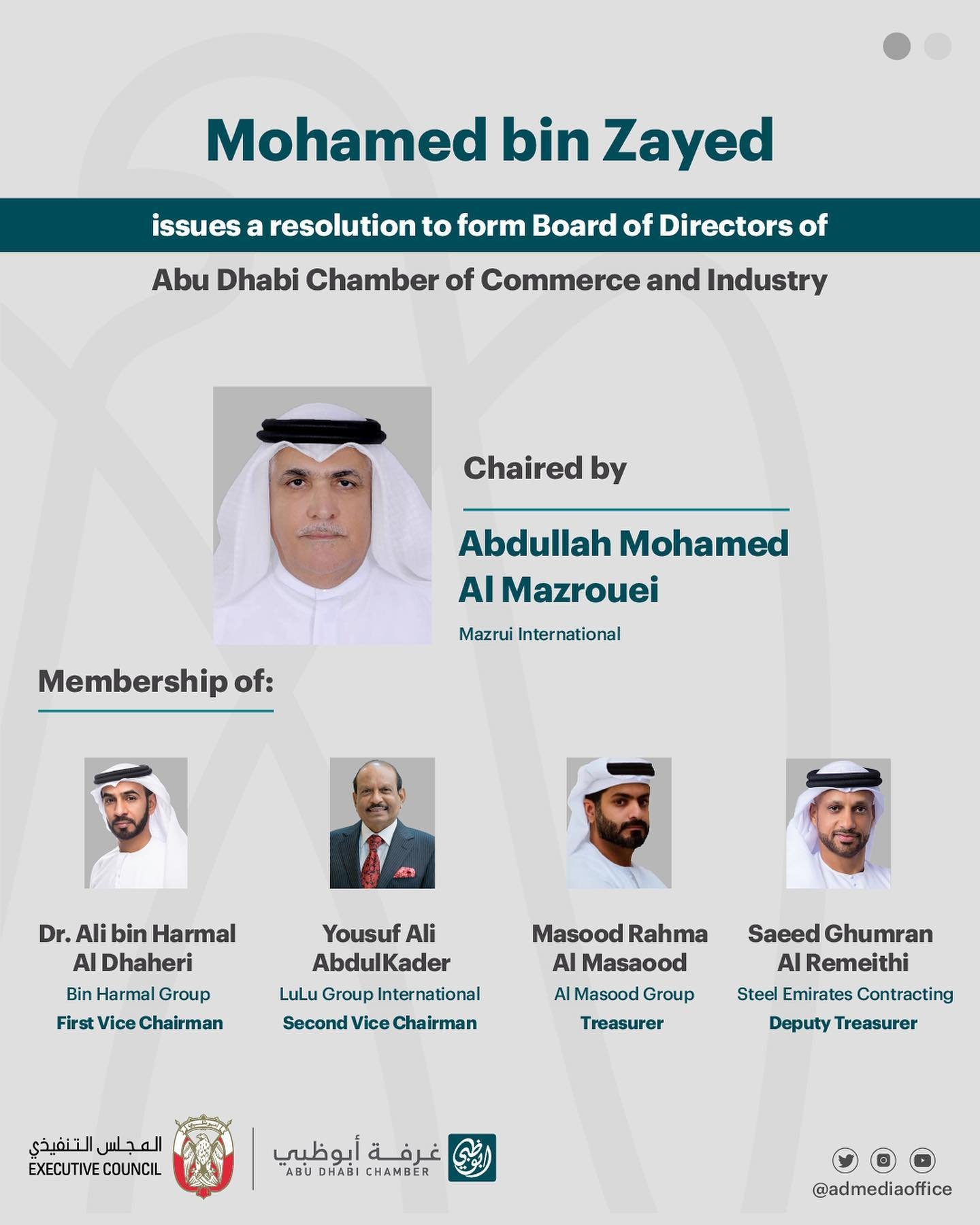 His Highness Sheikh Mohamed bin Zayed Al Nahyan, Crown Prince of Abu Dhabi, Deputy Supreme Commander of the UAE Armed Forces and Chairman of the Abu Dhabi Executive Council, has issued a resolution to form a new Board of Directors for the Abu Dhabi Chamber of Commerce and Industry.